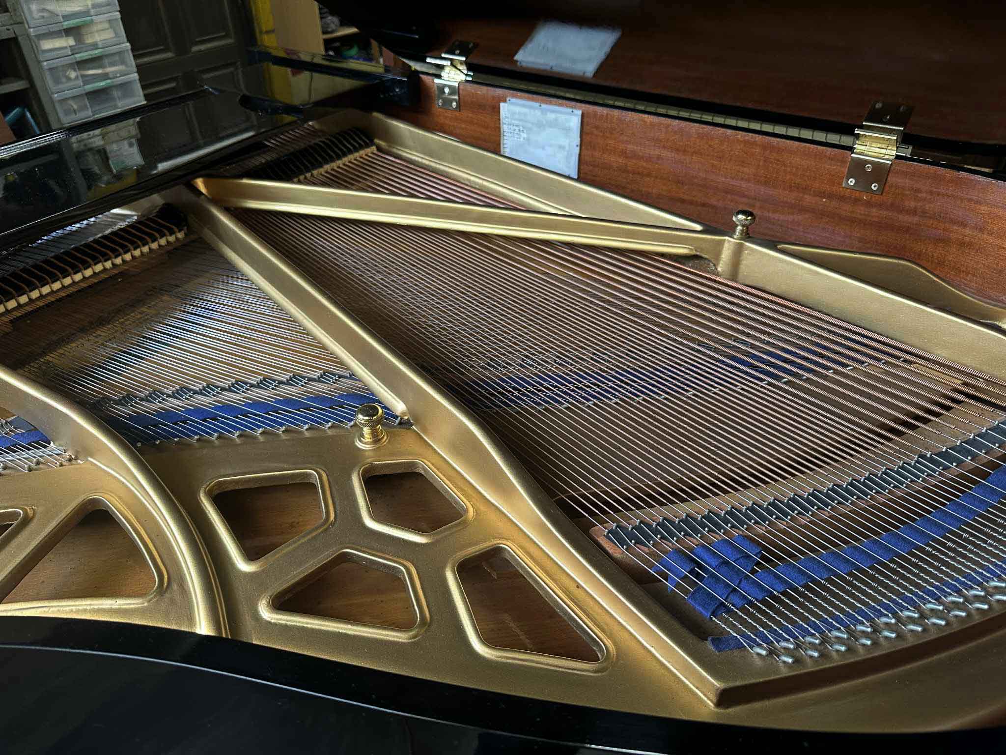 外装クリーニングは実施済み。全体の艶出しや金属パーツのクリーニングまで行い、到着後の印象もすっきり整えています。内部の整調・整音・調律はご成約後、出荷前に当店工房で実施し、タッチの重さや音色の方向(明るめ/やわらかめ)についても可能な範囲でご希望に合わせて最終仕上げいたします。防振インシュレーターや敷板のご提案、設置場所の下見、搬入経路の確認、追加写真のご用意も承ります。