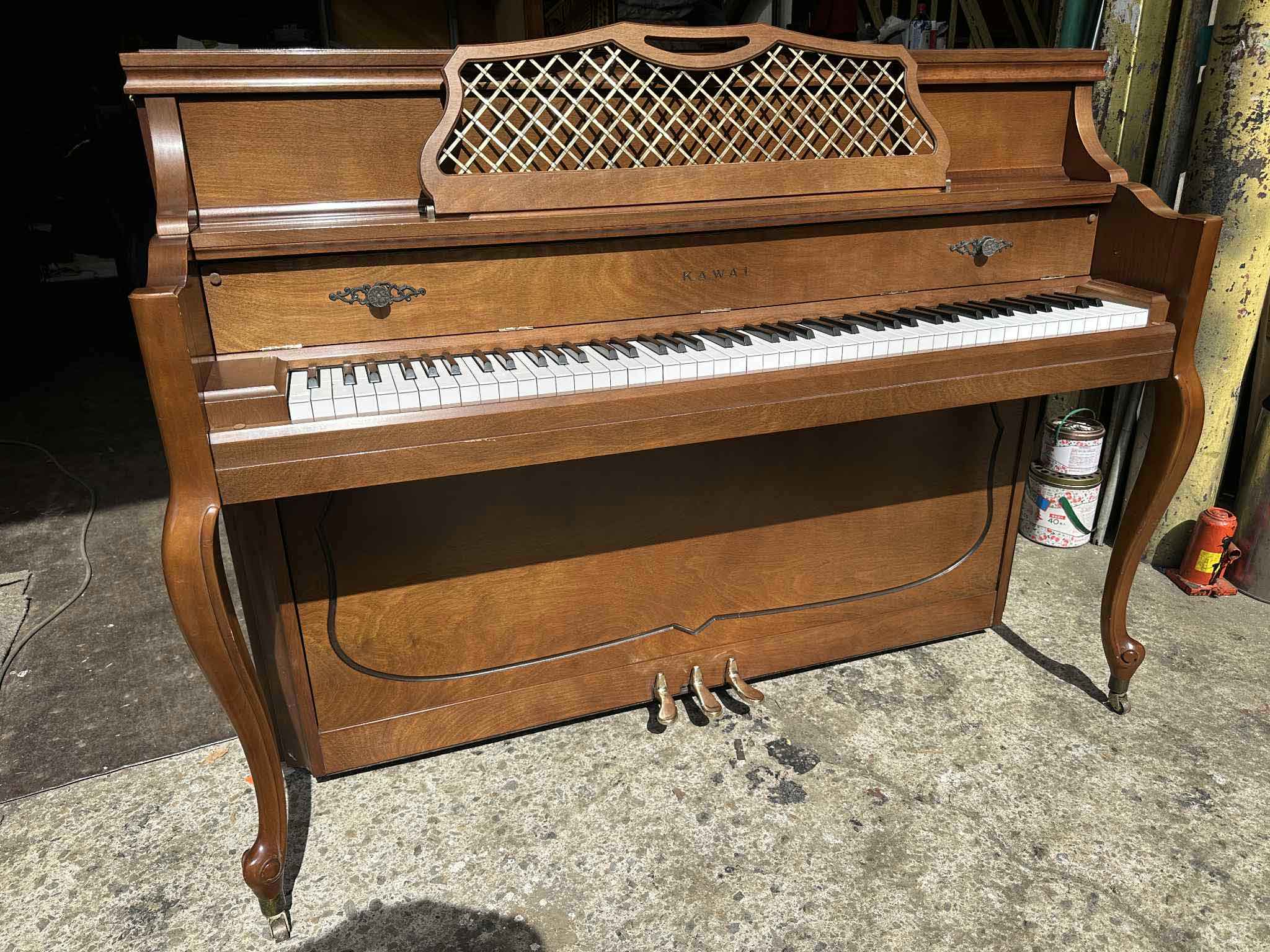 外装はすでにクリーニング済みで、金属パーツのくすみ取りや全体の磨き上げまで実施済みです。内部の整調・整音・調律はご成約後、出荷前に当店工房で実施し、タッチの重さや音色の方向(明るめ/柔らかめ)についても可能な範囲でご希望に合わせて最終仕上げいたします。設置後すぐに安心して弾き始められるコンディションでお届けします。