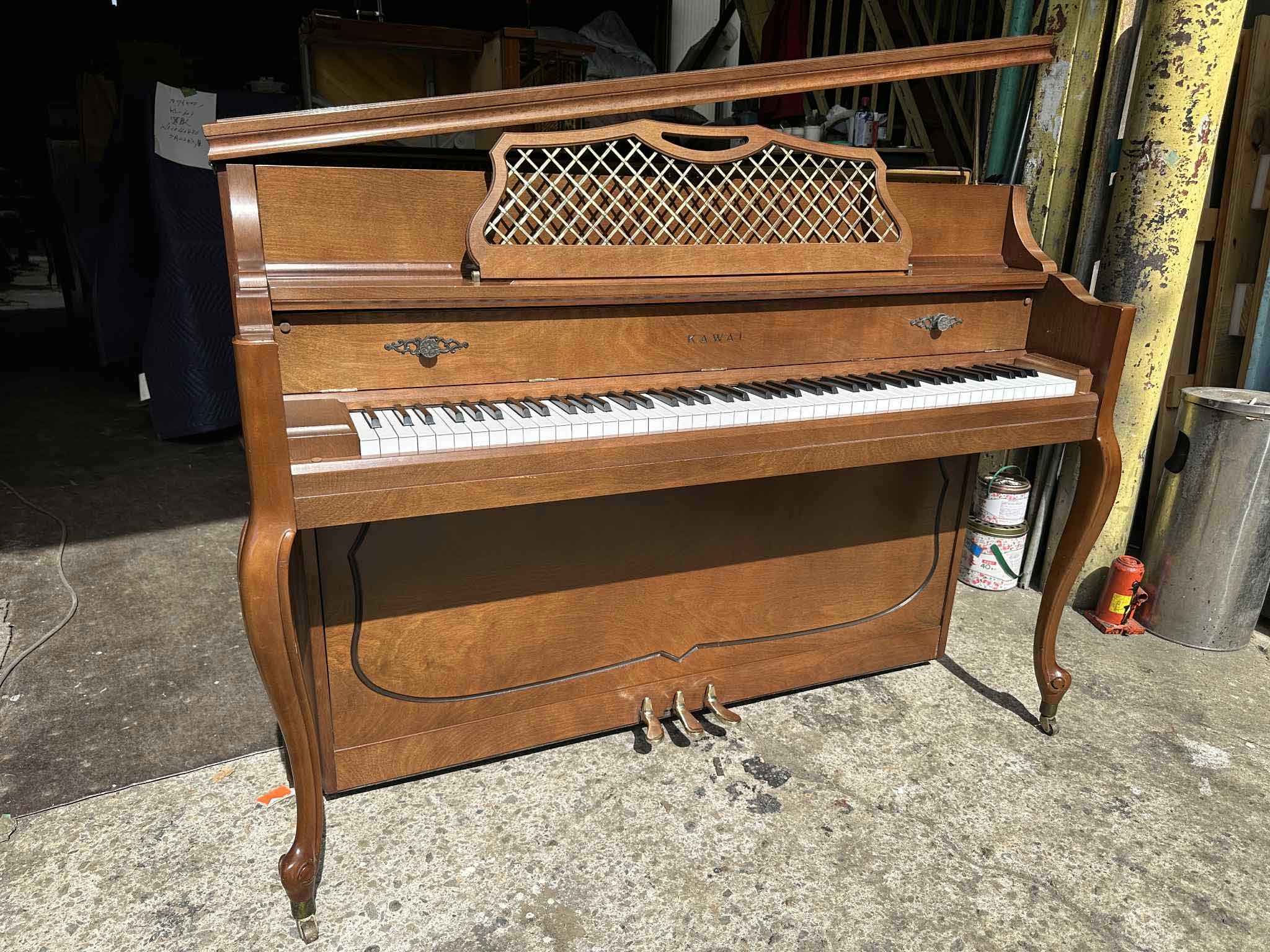 KAWAIというピアノメーカーに聞き馴染みのある方も多いかと思いますが、今回入荷したKL-603は、家具調の意匠が美しいコンソールタイプ。写真の通り、上前板には透かし格子の譜面台、優雅な猫脚(チッペンデール)、温かみのあるウォルナット木目の外装が目を引きます。トップリッドはグランドピアノのように開閉でき、音抜けと見栄えの両面でリビングに映える一台です。