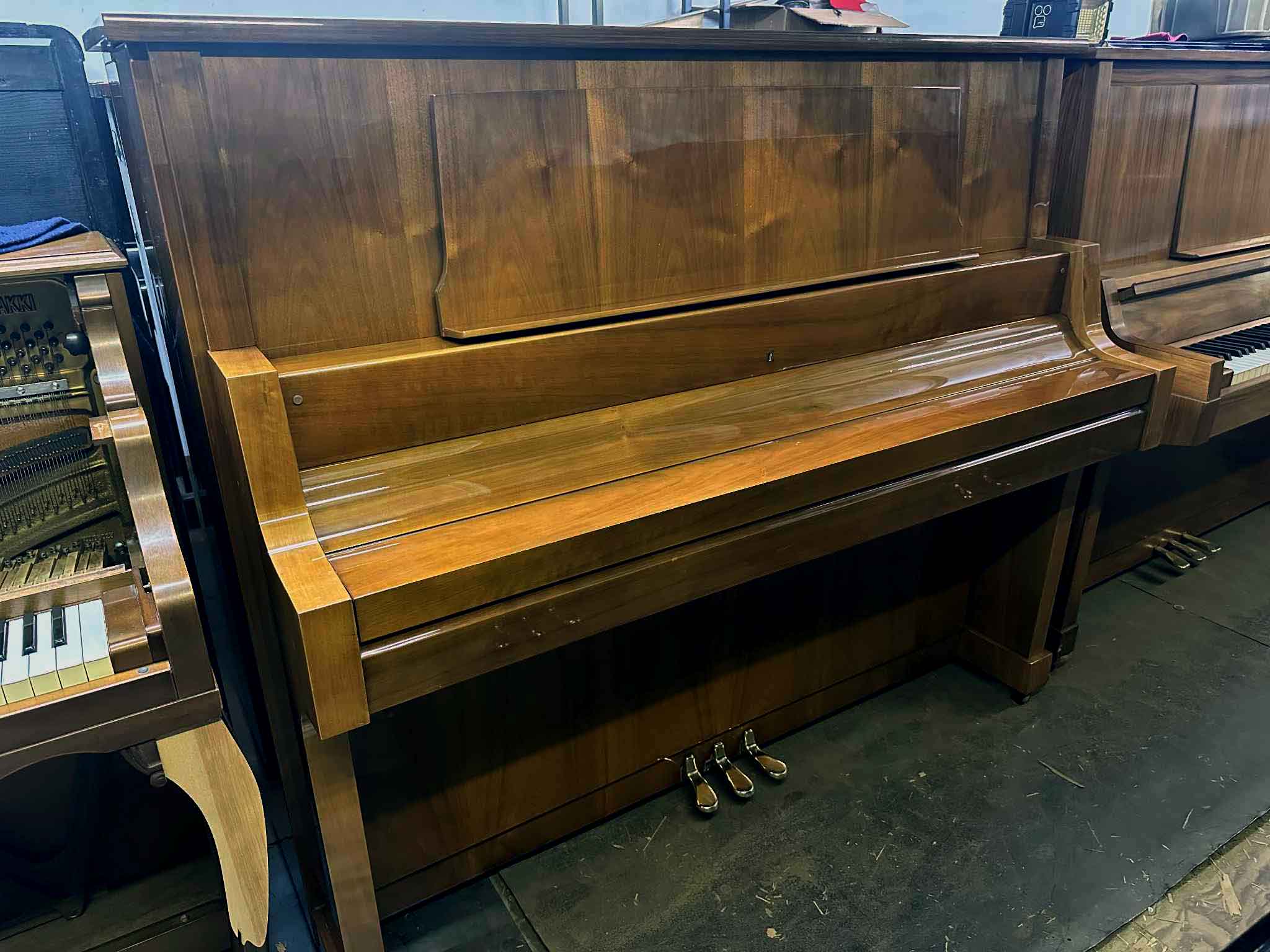外装はすでにクリーニング済みで、金属パーツのくすみ取りや全体の磨き上げまで実施済みです。内部の整調・整音・調律はご成約後、出荷前に当店工房で実施し、タッチの重さや音色の方向(明るめ/柔らかめ)についても可能な範囲でご希望に合わせて最終仕上げいたします。設置後すぐに安心して弾き始められるコンディションでお届けします。